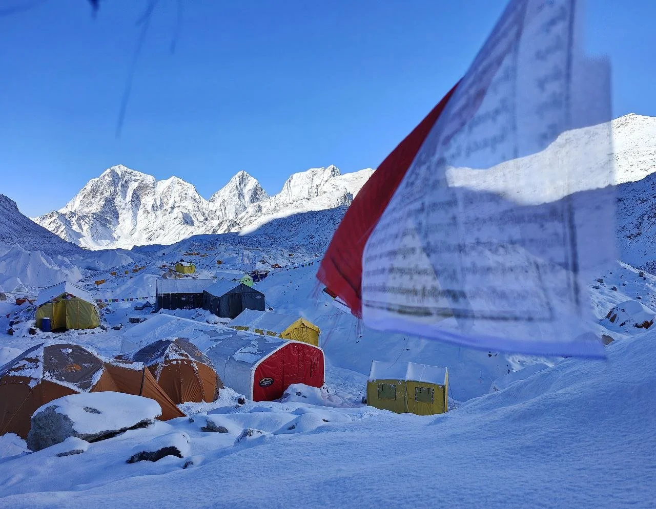 But our team of experienced Sherpas (with 15 Everest summits among the four of them) doesn't quite agree, and I tend to side with them. Since we will be continuously breathing oxygen above 7,000 meters anyway, there is no point in risking damaging our bodies by staying too long in the preparatory phase at high altitude. The approach on Everest is therefore rather to sleep only 3 or 4 nights at 6,400 meters and briefly ascend to 7,000 meters without sleeping there... I think that's the compromise we'll be moving towards next week as soon as the weather allows.